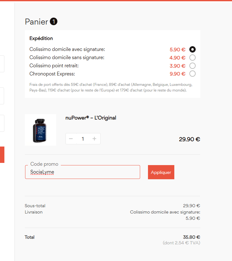 Lors de la validation de votre panier sur Nutriting vérifiez si le champs « code promo » ou « code de réduction » apparaît. Si c’est le cas il vous suffira de vérifier les codes promos disponible sur SociaLyme pour les utiliser dans ce champ.